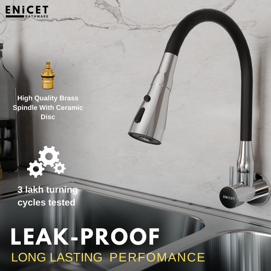 Enicet Flexible Neck Sink Tap for Kitchen, Wall Mount, Chrome Finish, 3 Flow Function, 360 Swinging Swivel Spout, Brass Build, Kitchen Sink Tap