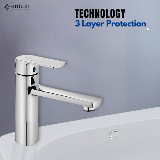 ENICET rust-resistant Single Lever Basin Mixer, 12 Inch Long Body, Chrome Finish, Hot and Cold Water Mixer Tap, 7 Years Warranty, Bathroom Wash Basin Tap
