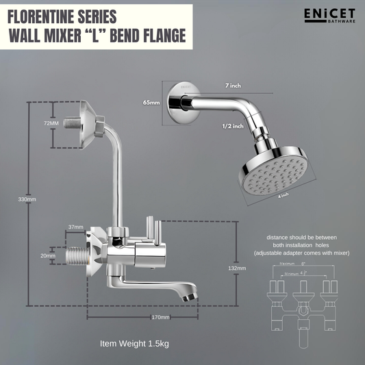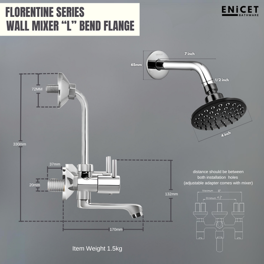 ENICET Brass Wall Mixer with 190mm Long Bend Pipe, Chrome Finish, Provision for Overhead Shower, Wall Mixer for Bathroom, Water Mixer Tap for Bathroom Full Set