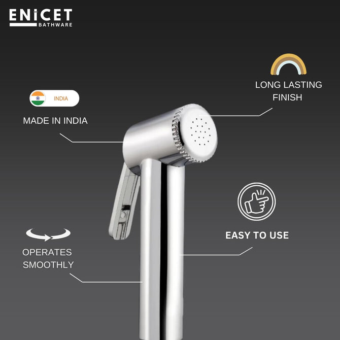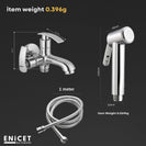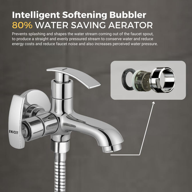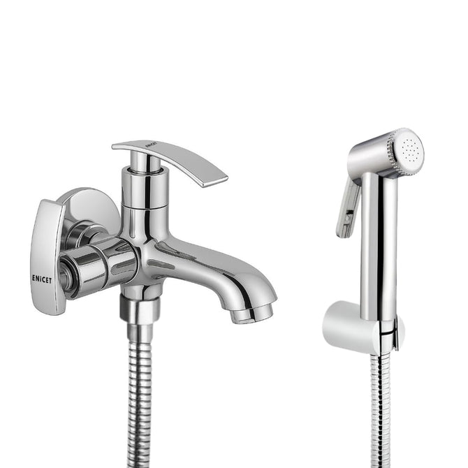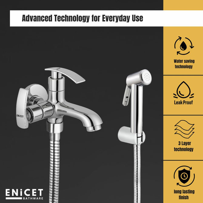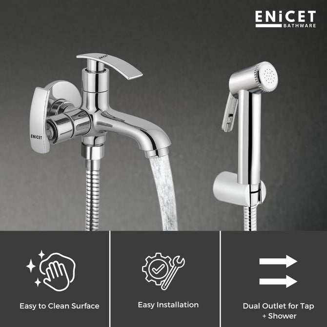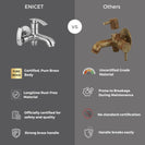 Introducing our premium 2-in-1 Bib Cock, expertly crafted from brass, offering exceptional durability and a rust-resistant finish that ensures a long-lasting, pristine look in your bathroom. This tap is designed for superior functionality with its leak-proof and sturdy construction, making it a reliable choice for everyday use. Equipped with 2 outlets and a single handle, this modern bathroom tap allows you to easily switch between a hand shower and spout—just turn the handle left for the hand shower and right for the spout, perfect for pairing with a health faucet or hand shower. The smooth internal surface guarantees no resistance to water flow, enhancing water pressure efficiency. Additionally, the brass cartridge ensures long-term, consistent performance, while the included wall flange ensures a seamless installation. With a 7-year warranty, you can be confident in the quality and durability of this two-way tap. Ideal for modern bathroom setups, this angle cock is the perfect solution for those seeking a stylish yet practical tap for bathroom use.