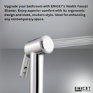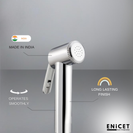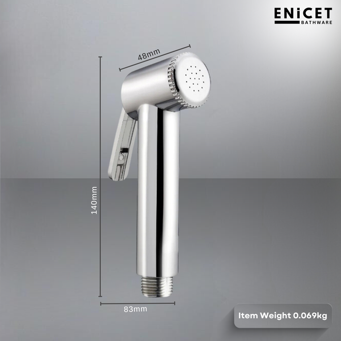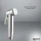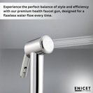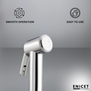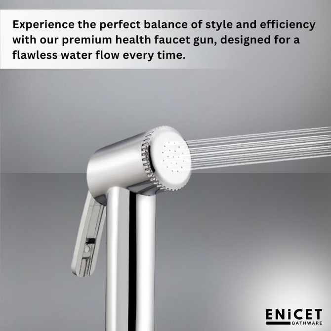 The ENICET ABS Health Faucet Gun is designed to elevate your bathroom's hygiene and functionality. Crafted with a 1-meter stainless steel hose and a robust ABS faucet gun, this sleek and modern bidet spray is ideal for toilet use. The chrome finish enhances its aesthetic appeal while offering excellent resistance to rust, smudges, and water spots. Featuring a 360-degree rotating brass connector, the faucet prevents tangling, ensuring smooth and precise water flow control. The anti-splash nozzle delivers a clean, controlled spray, minimizing water wastage and keeping your bathroom tidy. Easy to install with a wall-mounted design, this jet spray provides a convenient and reliable cleaning solution backed by a long-lasting warranty.