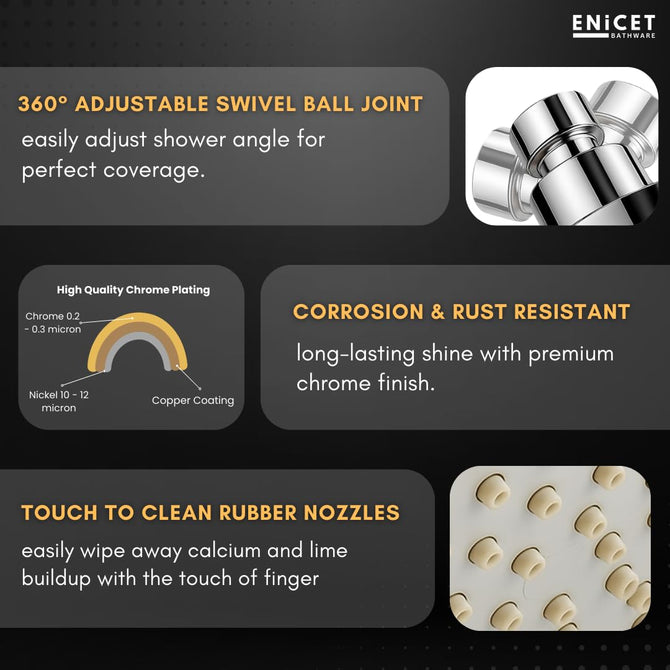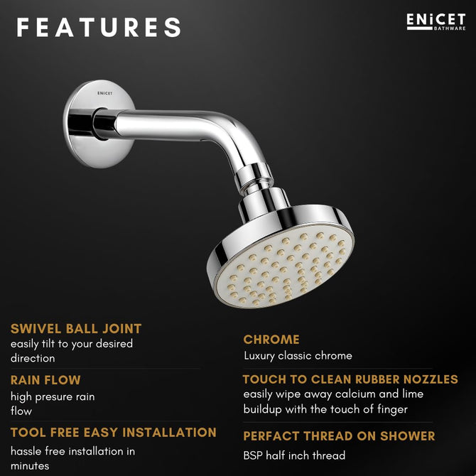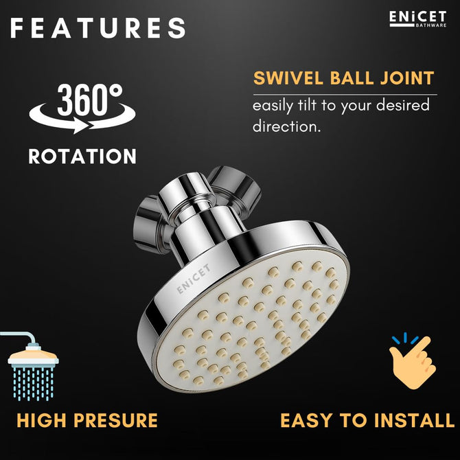 Transform your daily bath into a luxurious experience with this premium shower head for bathroom, designed to deliver both style and performance. Made from high-quality ABS material, this round 4-inch over head shower features a stunning black finish that instantly upgrades your bathroom’s look. The precision-engineered rain shower head for bathroom provides a gentle yet refreshing rain flow, turning your shower into a spa-like retreat. Soft rubber nozzles can be cleaned easily by touch, preventing blockages and ensuring consistent water flow. The 360° rotating head offers flexibility, letting you adjust the angle for the perfect shower. Designed as a high pressure shower head, it works brilliantly as a shower pressure booster head, giving you an energizing rinse even in low water pressure areas. Compatible with all standard shower arms, it’s easy to install and ideal for any bathroom shower set or sawar for bathroom upgrade. Built to last with exceptional durability, this head shower for bathroom comes with a 1-year warranty for peace of mind. Perfect for homes, hotels, and modern bathroom setups — enjoy unmatched comfort and lasting quality every day.