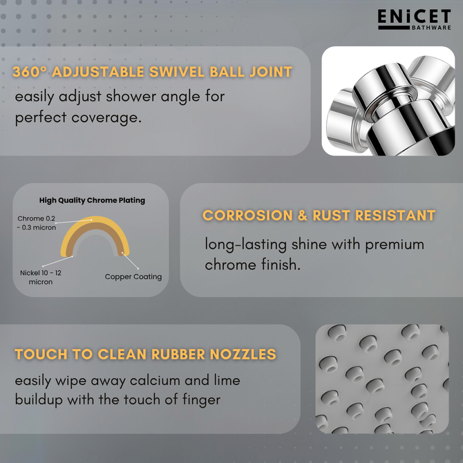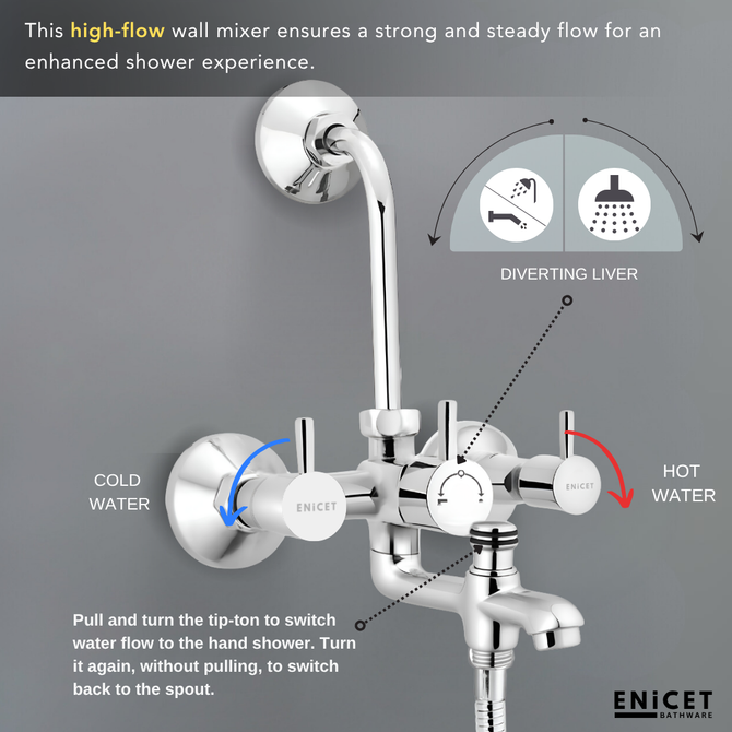 Upgrade your bathing experience with this premium wall mixer for bathroom 3 in 1, crafted from N53 grade brass for long-lasting durability and strength. The elegant chrome finish adds a modern touch to your bathroom while ensuring resistance against rust, corrosion, and daily wear. This bathroom shower set comes with a 3-in-1 mixer tap for bathroom that allows you to conveniently use the 4-inch overhead shower, 5-function hand shower, and 2-in-1 spout for a complete bathing solution. The overhead shower is equipped with soft rubber nozzles that can be cleaned effortlessly with just a touch, ensuring consistent water flow and zero blockages. The hand shower features a stainless steel 1.5-meter flexible tube for easy movement and multiple spray functions for personalized comfort. Its foam flow spout delivers smooth water output, enhancing efficiency and luxury. Designed to be leak proof, rust resistant, and easy to maintain, this bathroom mixer 3 in 1 with shower is a perfect combination of style and utility. With a 7-year warranty, this shower set for bathroom full set offers reliability, comfort, and sophistication, making it an ideal choice for modern bathrooms.