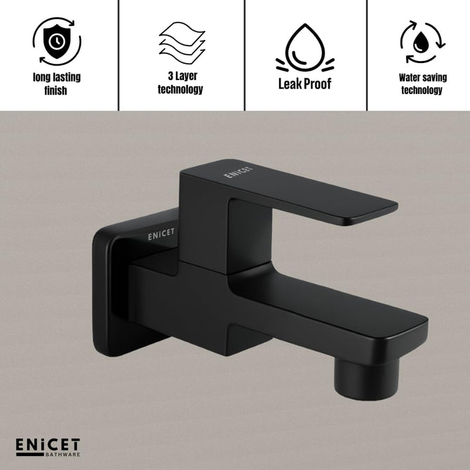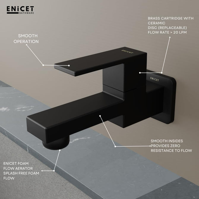 Enhance your bathroom with the ENICET Brass Tap – a stylish and durable solution for modern homes. This wall-mounted bib cock is made from high-quality brass, ensuring strength, rust resistance, and long-lasting performance. The elegant matte black finish gives your bathroom a contemporary and premium look, blending seamlessly with modern interior styles. Its short body design makes it ideal for compact spaces without compromising on utility. The tap features advanced foam flow technology, providing a soft, splash-free water stream that reduces water wastage and makes everyday use more comfortable. It comes with a sturdy wall flange for secure installation and a neat finish. Whether you are renovating your bathroom or setting up a new one, this tap fits perfectly and adds a touch of sophistication. ENICET offers a 7-year warranty, reflecting confidence in the product’s durability and quality. Easy to maintain and simple to install, this brass tap is perfect for homes, hotels, and guest houses. Choose ENICET for long-term reliability, elegant design, and efficient water flow – everything you need in one premium bathroom tap.