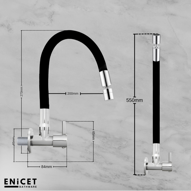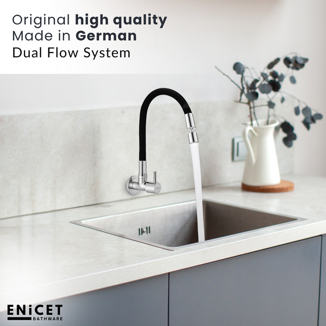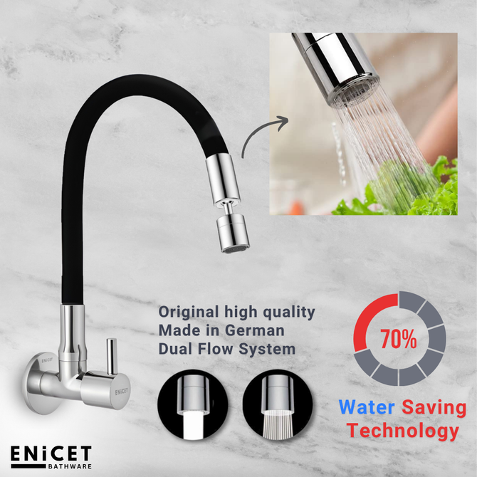 Upgrade your kitchen with our innovative Dual Flow Sink Cock, designed to enhance both functionality and style. This flexible sink tap features a German-made double flow head, allowing you to easily switch between standard and spray functions for versatile water usage. Crafted from N53 grade brass, this tap is built to withstand daily wear and tear, ensuring durability and reliability. The sleek black silicon-coated body not only offers a modern aesthetic but is also rust-resistant for easy maintenance. With a chrome-plated handle that operates smoothly with a quarter turn, you can effortlessly control water flow with precision. The adjustable angle head and flexible spout provide added convenience, making it easy to direct water exactly where you need it, whether you’re rinsing dishes or filling pots. Designed with a wall flange for a tidy installation, this leak-proof tap guarantees a clean and efficient kitchen experience. Backed by a generous 7-year warranty, our kitchen sink tap is the perfect blend of style and practicality. Transform your culinary space with this versatile kitchen tap extension flexible, and enjoy a new level of convenience today!